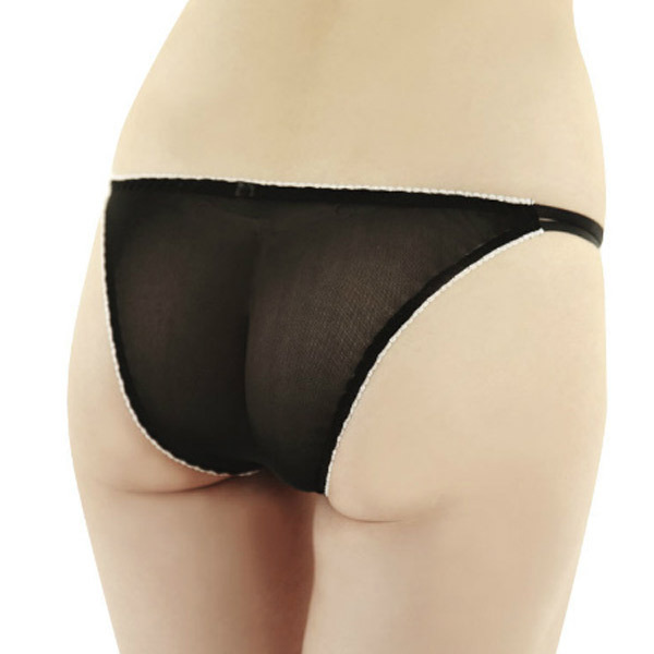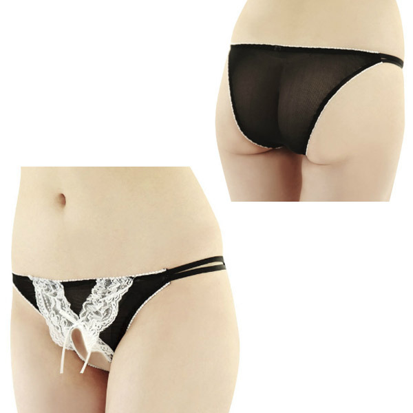 <EROX>白いフリルが蝶みたい!ブラック+ホワイトレースのハーフバックオープンショーツです。繊細なラッセルレースはギャザーが入って立体的。ショーツのサイドを華奢な2本ラインにする事で、足を長くセクシーに見せます。