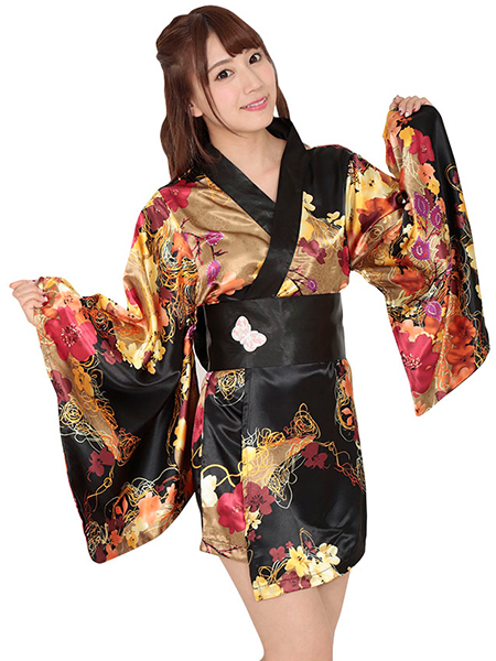 その姿はまるで夜の蝶…!艶やかな色彩が映えるセクシーなミニ着物コスチューム。黒地に鮮やかな花と蝶をあしらった、豪華絢爛な着物風ドレスが登場!後ろ姿を飾る黒帯は作り帯なので、本格的な着こなしが簡単に出来ちゃいます。