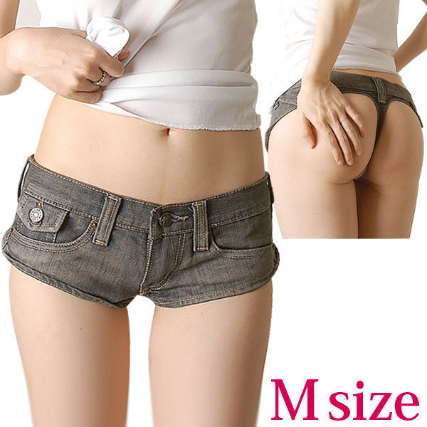 ショーツ感覚で新しい履き心地!?デニムが超セクシーなデザインになって登場!前から見たらオシャレなグレーのホットパンツ。だけど、後ろから見るとまるでTバックショーツみたいにお尻が丸見え!お尻フェチにはたまらないセクシーさ!特別な日や刺激的なコトがしたい時、彼を驚かすのにピッタリのコスチュームです!こちらはMサイズ。※XLサイズ(b18364)あります