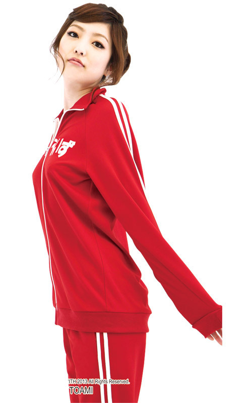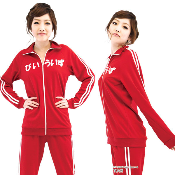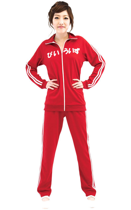 熱血、体育会系!夕日に向かってランニングしたくなる、赤ジャージコスチューム。白いダブルライン&胸元のロゴデザインで雰囲気も抜群。フロントファスナー開きの長袖トップスと、長ズボンがセットになった体操服コスプレです。