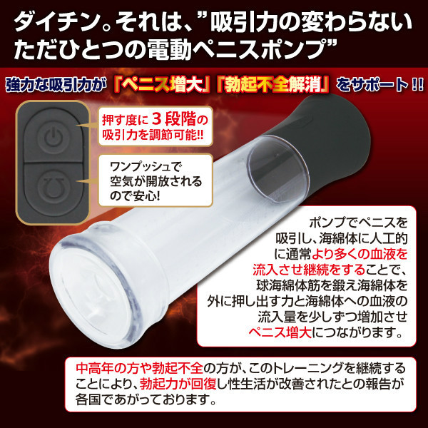「ペニスを増大したい」「勃起不全を解消したい」といった男性のお悩みもこれで解決!お悩みを解決しながら快感も得られる、まさに一石二鳥の電動ペニス増大ポンプ「dytin ダイチン」です。本体に付いた2つのボタンスイッチのうち、上のボタンを押すことで吸引開始!ボタンを押す度に3パターンの吸引力がお楽しみいただけます!使用を止めたい時は、下のボタンをワンプッシュするだけで空気抜きができます。個人差はありますが、日々トレーニングすることで見る見るうちに逞しさが戻ってくる!幅広い年齢に人気のある男性補助グッズです。