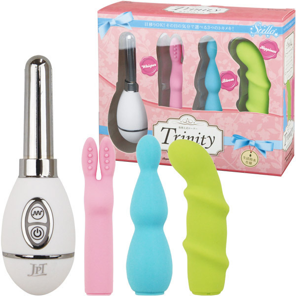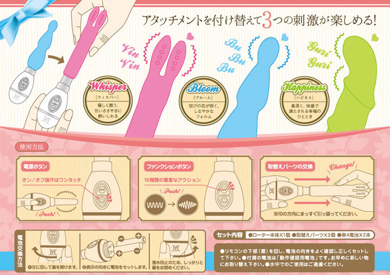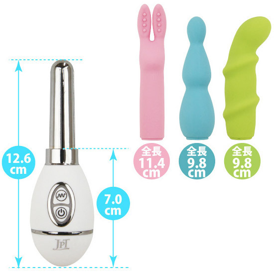 可愛いパステルカラー!特徴的な形状のアタッチメントキャップを交換して使えるスティックローター。10種類の多彩な振動とボタンを押すだけの操作性がGOOD!手に馴染みやすい卵型グリップを採用した技ありローターです。3つのキャップは、クリや乳首を挟んで刺激できるイボ付き耳のピンク、丸い先端と2つのくびれがほどよく括約筋を刺激するブルー、Gスポットに届きやすいカーブと螺旋のグリーン!もちろん、これらを被せなくても遊べます。