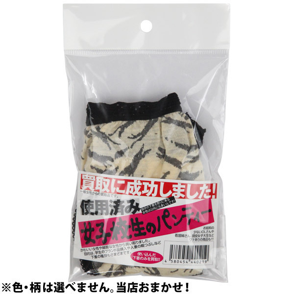 女子校生の履いていた下着をゲット!使用済みのエッチな生パンティー(1枚入り)。匂いフェチの妄想族にはたまらない夢のお宝アイテム!直接匂いを嗅いだり、エアドールに履かせてみたり、自分で履いてみたり…と使い方は貴方のお好みで!その生々しい使用感に興奮が止まらないフェティッシュな匂いグッズです。※中身の色柄、形状等はその都度異なります※USED加工を施した新品未使用品です