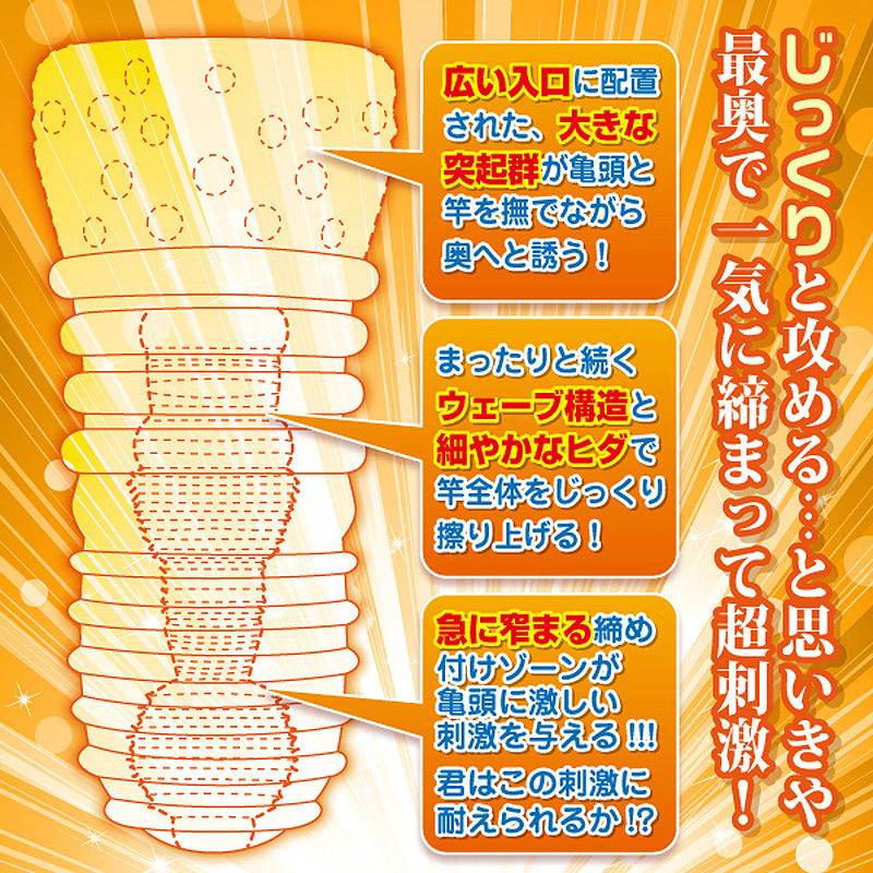 攻めの快感にムスコも即ノックアウト?バツグンの締め付けが魅力の貫通型オナホール。●挿れやすさ満点の大きな挿入口●入り口から丸見えの突起群で奥へと誘導●中盤の微細ヒダでまったり&じっくり刺激●突然の極狭ゾーンで亀頭に高刺激●むっちり肉厚なハードエラストマー使用●ミニローション付属。スローセックスのようにまったり楽しめる…と思いきや突然現れるキツキツゾーン!キュッと締め上げる魅惑のトレーニングに完敗必至のクリアオナホールです。