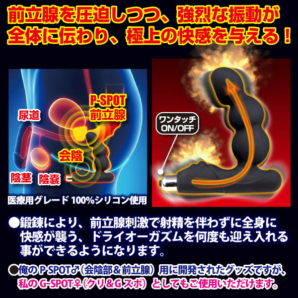 極上のドライオーガズムを体感せよ!男が感じる究極の性感ポイント、会陰部から前立腺までをダイレクトに刺激する電動エネマグラ。●医療グレード100%シリコン素材を使用●電源ON/OFFが片手で操作できるワンタッチスイッチ●前立腺に猛烈な刺激を与える三連球形状●女性のクリ&Gスポット責めにも最適。前立腺を圧迫しつつ、性器全体に刺激を与える…!アナニー好きやマニアには特にオススメのアナルグッズです。