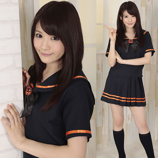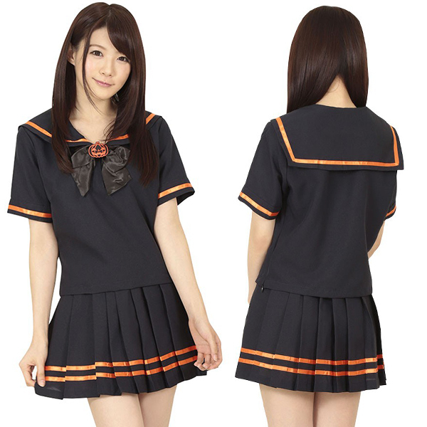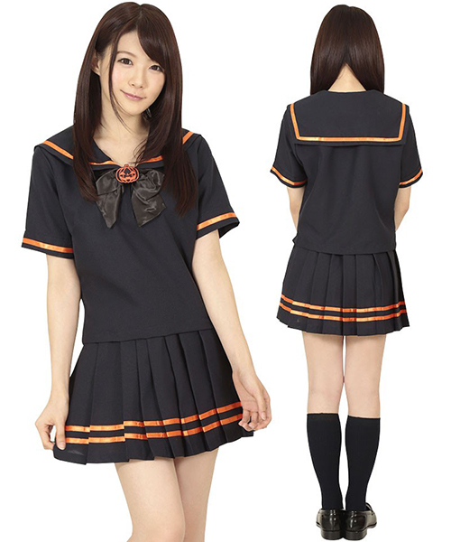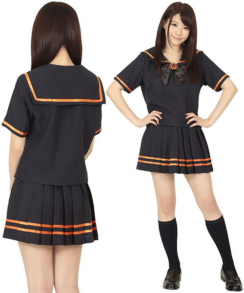 制服コスプレでさりげなくハロウィンモード♪ブラック×パンプキンカラーのセーラー服。●黒ベースの半袖セーラー服●オレンジカラーのライン入り●遊び心満載の可愛いワッペン付き。リボンやセーラー襟にはハロウィンの風物詩「ジャック・オー・ランタン」のワッペンが!ホームパーティーやお店のイベントにもオススメのコスチュームです。※靴下は付属しません。