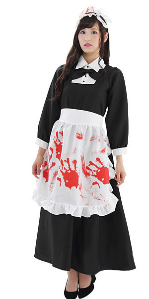 うそっ、血まみれ…?!赤い手形がベッタリついたホラーテイストのメイド服。●ハロウィン仮装に便利●定番の白黒メイドを一瞬ぎょっとするほどスプラッターに…●スカート丈が足首まであるクラッシックな長袖ワンピース●後姿はごく普通●手形ペタペタ・フリルエプロン●血が飛沫したブリムカチューシャ。一体型ワンピースは鮮血加工されていないので、お手持ちのエプロンを着ければ普通にお使いいただけます。