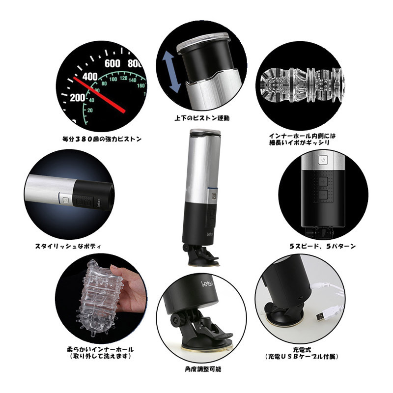 人気ブランド「Leten」商品がついに日本上陸!第一弾は男性用のUSB充電式電動オナホールです。●スタイリッシュなピストンオナホール。●便利なUSB充電式。●2時間の充電で稼働時間は最大90分。●角度調節可能。●平らな場所にしっかり固定できる強力吸盤付き。●取り外し可能・繰り返し使えるインナーホール(イボヒダ構造)。●電源ON/OFF&振動切替え(上ボタン)。●+・-ボタンでスピードアップ&ダウン。●LEDランプ搭載。●最高380回転!約4.5cmの強力ピストン。●5スピード×5パターン調節可能。手を使わずにプレイできるハンズフリーオナニー対応アイテム!極上の刺激と快感を存分に楽しめる電動ピストンオナホールです。
