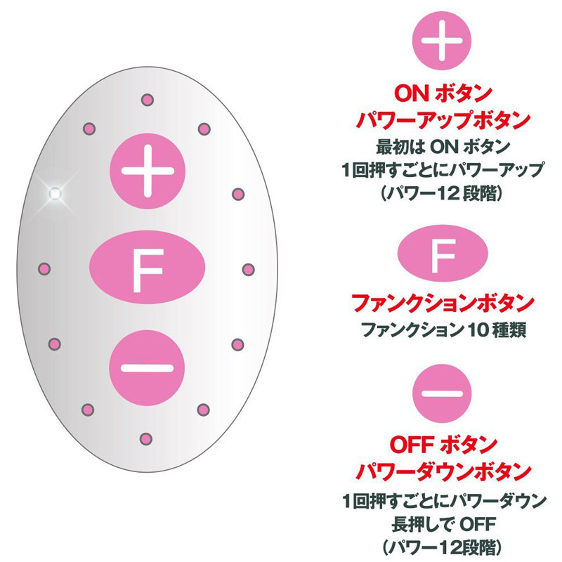 知ってるアレとは少し違う?多彩な振動がウリの優秀シングルローター。●スタンダードなエッグ型タイプ●握りやすいスティックリモコン●12種強弱×10種リズム→120種振動●+…電源ON・パワーUP●-…電源OFF(長押し)・パワーDOWN●F…10種パターン切り替え●静音設計&生活防水仕様。もう普通のローターには戻れないかも!小さな体に多彩なアクションをぎっしり詰め込んだピンクローター。「BIG」という名前ですが大きさは定番のシングルサイズです。