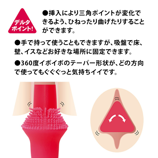 曲げたりひねったり自由自在に形を変えられる!三角刺激が新感覚な吸盤付きディルド。イボやヒダとは違う三角形ならではの快感!中腹部分の細かな突起は挿入するほどに入り口が広がり快感アップ、弾力のある抜群の挿入感で貴方の中を満たします♪先端部分は溝付で潤滑液が絡みやすく、潤いに悩む女性も使いやすくなっています。