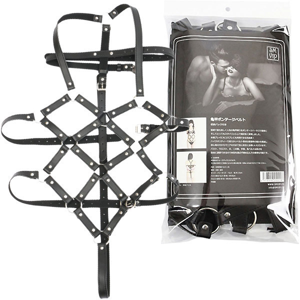 人気の緊縛スタイル、亀甲縛りをハーネスベルトで表現したボンテージコスチューム。●亀甲縛り仕様のボンテージ●優しい柔らかなベルト素材●ハードなスタッズデザイン●各ベルトは長さ調節可能。着用するだけで亀甲縛りが完成!初心者さんでも緊縛プレイが楽しめるスタイリッシュなボンテージハーネスの緊縛ベルト。バストやウエストをサイズ調節できるので、本格的なSMプレイにもコスプレにも使えるハイクオリティなアイテムです。※画像では商品とは別にブラ、ショーツを着用しております。
