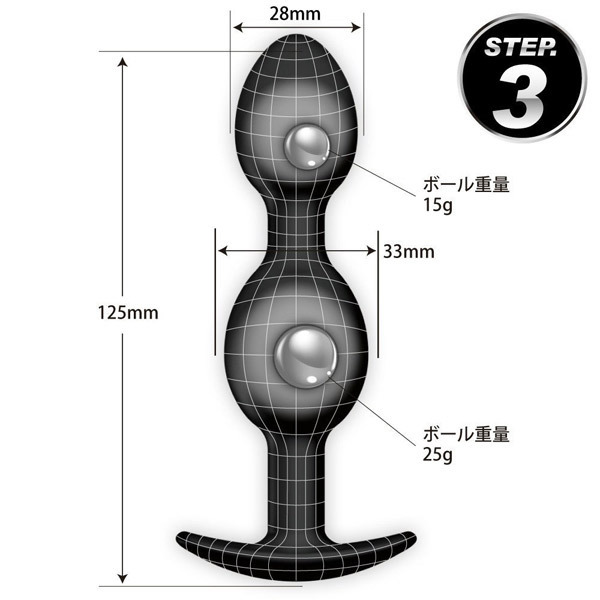 内蔵ボールが中からノック!心地良い刺激がクセになるシリコン製アナルグッズ「プリティラブ スペシャルアナルプラグ STEP3」。●全長12.5cm×最大径3.3φcm●大小2連団子型の「STEP3」●ストッパー付きのプラグ形状●安心安全な高品質シリコン素材●メタルボール2個(小15g・大25g)を内蔵●自在に動いて存在感をアピール。アナル開発や日常装着用に♪コンッコンッとノックするような刺激を楽しめるメタルボール入りアナルプラグ。シリーズ最大ボディの「STEP3」は、異なる重量のメタルボール2つが各々動くランダム刺激を楽しめます。