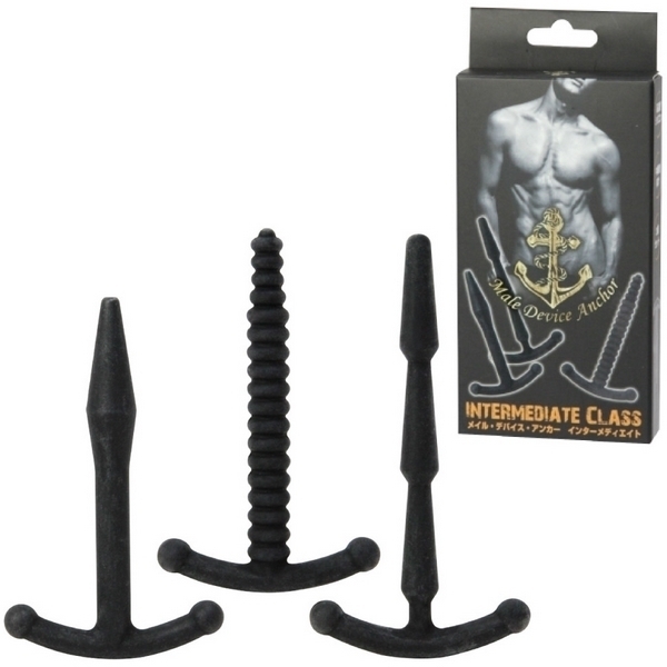 CBT中級者さんの尿道責めプレイに♪錨デザインの尿道プラグ3個セット「メイルデバイスアンカー インターメディエイト」。●マニア向けの尿道プラグ×3個セット●柔軟性のある高品質シリコンを採用●長さのある中級者向けのミドルサイズ●タイプ1:挿入部長5.9cm×直径0.9cm●挿入しやすい矢尻型のヘッド形状●タイプ2:挿入部長5.9cm×直径0.7cm●最初から最後まで続く凸凹リブ形状●タイプ3:挿入部長6.9cm×直径0.7cm●引き抜き時が刺激的な3連の円錐形状。究極の快感テクニック、尿道責めで新たな快楽を!フェティッシュなCBTプレイ用のSMグッズ。刺激の高さと負担の少なさを両立させた程良い長さの「インターメディエイト」タイプは、尿道責めプレイ中級者さんの拡張用にも最適です。