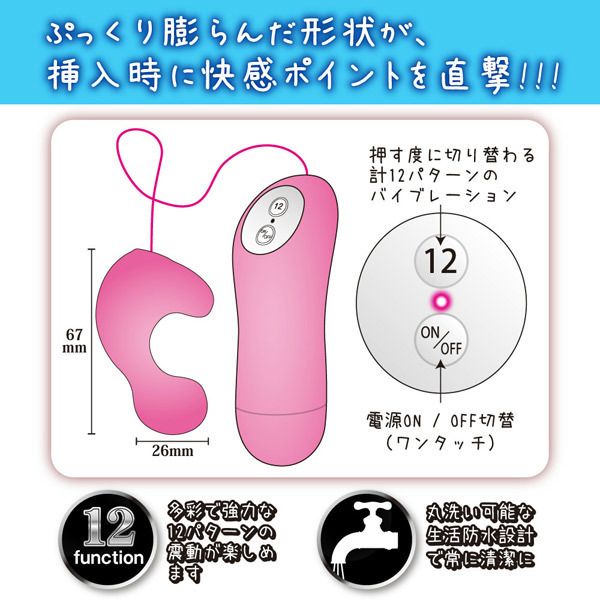 あなたはどっち派?Gスポ直撃シリコン製ローター「中イキローター」。程よい柔らかさのシリコン製ボディが優しくフィット!人間工学に基づいたぷっくり膨らみフォルムが挿入時にGスポットを直撃します。ボタンを押す度に切り替わる多彩で強力な計12パターンの振動機能を搭載!挿入だけでなくクリや乳首への押し当てによるピンポイント刺激も可能です。中イキ派垂涎、至高フォルムのピンクローター!丸洗い出来る生活防水仕様でいつでも清潔に使えます。