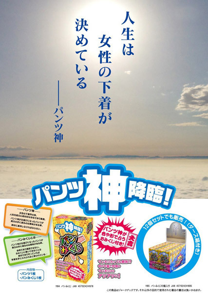 あなたの運命は神のみぞ知る?おみくじシート付きセクシーショーツBOX。●パンティ1枚+おみくじ1枚●カラーやデザインはランダム●彼女や友人へのプレゼントに●各種イベントの販促グッズに。パンティには神が宿っている!かどうかは分かりませんが、届いたパンツの色や形によって運勢が決まる(かもしれない)おみくじ付きパンティ。女性の下着界における絶対的な存在であり象徴である「パンツ神」に運命を委ねてみてはいかがでしょうか。