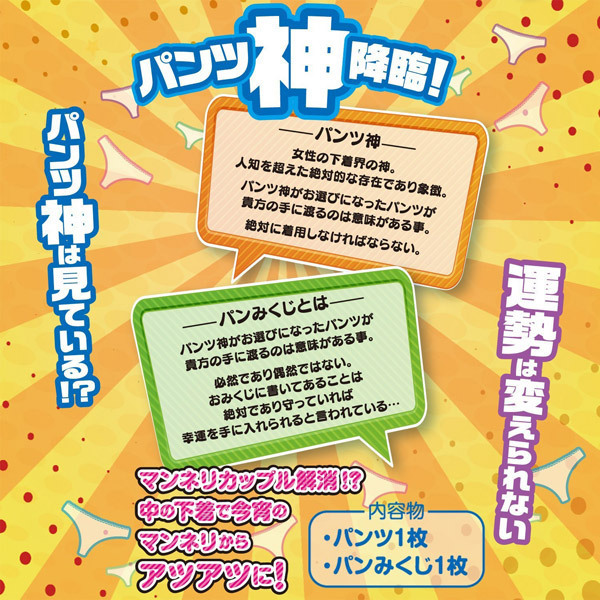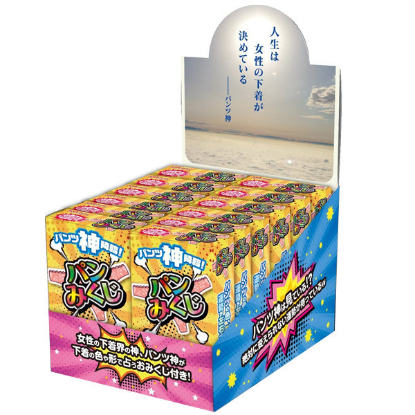 あなたの運命は神のみぞ知る?おみくじシート付きセクシーショーツBOX・12個セット。●パンティ1枚+おみくじ1枚●業務用1ダース(12個入り)セット●カラーやデザインはランダム●ディスプレイケース入り●彼女や友人へのプレゼントに●各種イベントの販促グッズに。販促用や大人買いの方はこちら♪パンティには神が宿っている!かどうかは分かりませんが、届いたパンツの色や形によって運勢が決まる(かもしれない)おみくじ付きパンティ・展示用ケース入り12個セット。女性の下着界における絶対的な存在であり象徴である「パンツ神」に運命を委ねてみてはいかがでしょうか。