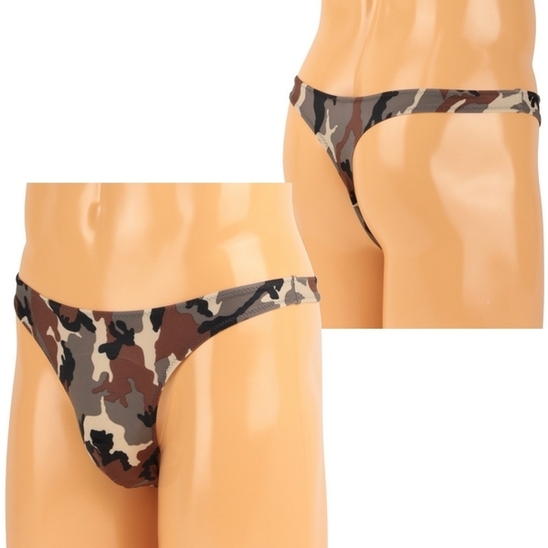 カモフラージュ柄でワイルドに♪全面プリントの迷彩柄メンズTバックショーツ。●ブラウン系のカモフラ柄ショーツ●ストレッチ生地でボディにフィット●食い込みがセクシーなTバック●男性用Mサイズ・日本製。カジュアルな迷彩柄がボディを彩るメンズランジェリー!フロントはゆったり大きめに、バックはキュッと引き締めたTバックでセクシーな仕上がりです。