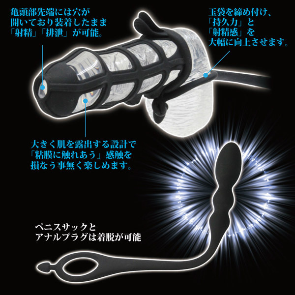 想像をはるかに超える未体験の絶頂感!メッシュ状ペニスサック+アナルプラグが合体した「PAアシストギア プラグ」。持久力サポートと前立腺刺激で射精感を大幅UP!高品質シリコン素材を採用したペニスサックは、挿入感を損なわないメッシュ形状!また、亀頭先端部に穴が開いているので装着したまま射精&排泄が可能です。さらに、玉袋を締め付けるリングで射精もコントロールしてくれます。アナルプラグはスルンと挿入しやすい凸凹タマゴ形状!サックとプラグは着脱出来るので単体でも楽しめます。