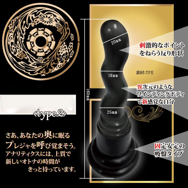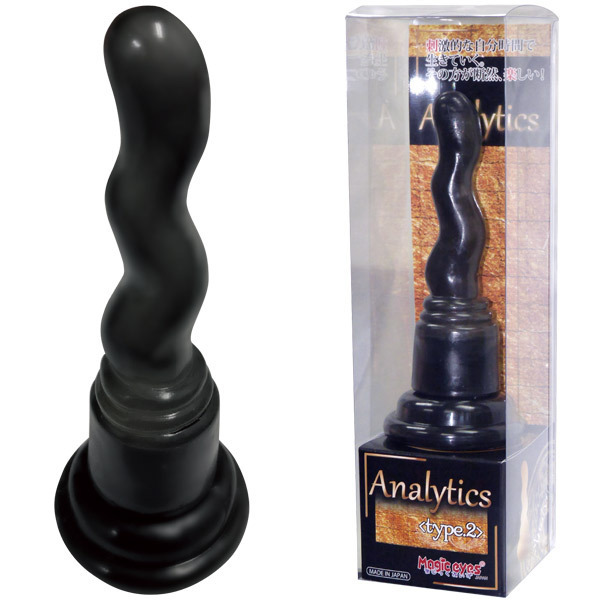連続ウェーブで目覚める快感!ワインディングボディの吸盤付きアナルディルド「Analytics(アナリティクス) type2」。●エラストマ素材の程良い弾力ボディ●全長16cmで初心者の挿入も安心●ポイントを狙う刺激的なウェーブ状●先端20mm、挿入部の最大径は25mm●安定感のある底部吸盤・日本製。入門者のアナル開発にも最適!丸みがあるので初心者でもスルリと挿入しやすい安心フォルムのアナルプラグ。手放しプレイができる吸盤付き!壁や床に固定すればプレイの幅も広がります。