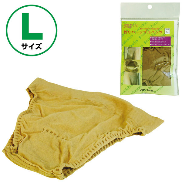 その日の気分で変身♪男女どちらも楽しめるハイブリッドな女装用パンティ「性リバーシブルパンツ(L)」。●肌触りの良いベージュ色のブリーフ●伸縮性抜群のストッキング生地を使用●パンティの前後に筒状のペニス収納袋●下向き装着:女性感覚ですっきりと収納●上向き装着:ペニスを擬似勃起状態で維持●フリーサイズ(最大ウエスト約85cm)●ペニスト筒サイズ(L):9.0×2.5cm。あなたの願望叶えます♪男女どちらにも固定可能な筒を内蔵!股間処理が簡単に出来るショーツ型のペニストッキング。下向き固定の場合はクロッチをずらせばそのまま排尿も可能!ピタっと密着するので包皮を剥いたまま固定すれば、包茎矯正用としても効果を発揮します。※品名のサイズ表記は「筒のサイズ」となり、ショーツは3サイズ全てフリーサイズです。