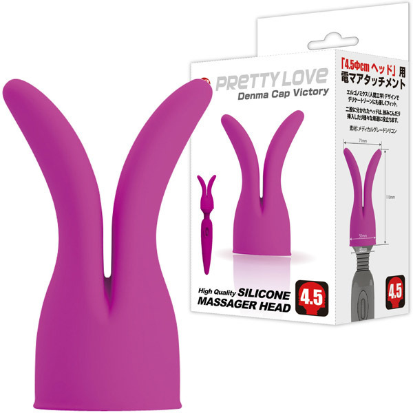 電マをさらに気持ちよくバージョンアップ♪うさ耳フォルムの電マ用シリコンアタッチメント「プリティラブ デンマキャップ ヴィクトリー」。さらっとした肌触りの良いシリコン製キャップ!敏感部分を挟み込んだり、両先端をまとめて挿入したりと様々な楽しみ方ができる二股デザイン!エアークッションによるソフトな弾力感でデリケートゾーンにも優しくフィットします。フェアリーミニや同シリーズのパワフルワンドマッサージャーなど、ヘッド径45mmの電マに装着可能です。