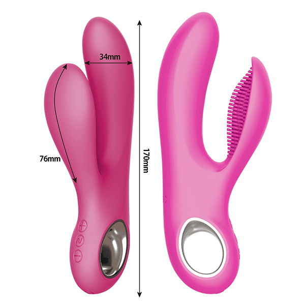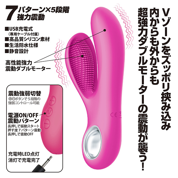 外から!……ナカからも!?V筋覆うダブルモーターで絶頂必至のハイパワーバイブレーターが登場。素材には高品質のメディカルグレードシリコンを採用!無数の突起がついた子機とバイブが一体となり、V筋ゾーンを挟み込んで刺激を与えます。7パターン×5段階もの振動調節ができるので、優しく振動させながらじわじわと快感を高めるのもいいですし、強力振動で一気に責め立ててみるのもいいかもしれませんね♪USB充電式で、およそ90分の充電で70分の連続稼動が可能です。コードレスで使えるからプレイにも集中できる!生活防水&静音設計も兼ね備えた高性能バイブレーターとなっております。