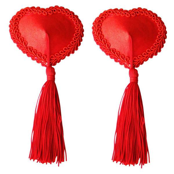 ピタッと貼るだけの簡単仕様♪バストトップ(乳首)に貼るだけで、手軽にオシャレが楽しめる下着感覚のニップルジュエリー「ニップルタッセル フリルサテンハート 赤」。複数回使用できる強力粘着シールタイプのボディアクセ。上品な光沢感のサテンを美しい装飾で縁取ったハート型ニップルと、ゆらゆら揺れるタッセルを組み合わせたゴージャスなデザインは、ショータイムやナイトパーティーにも最適です。