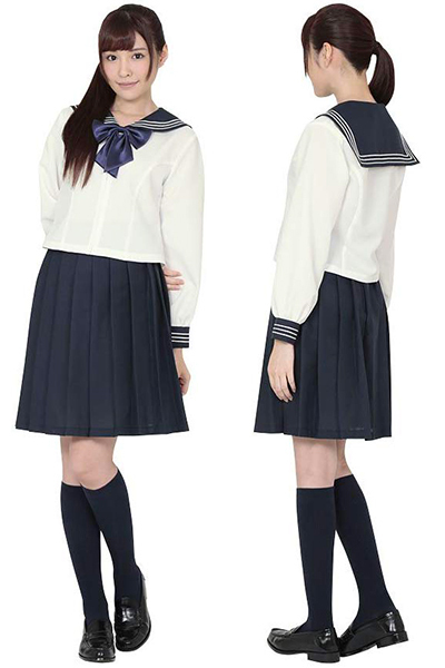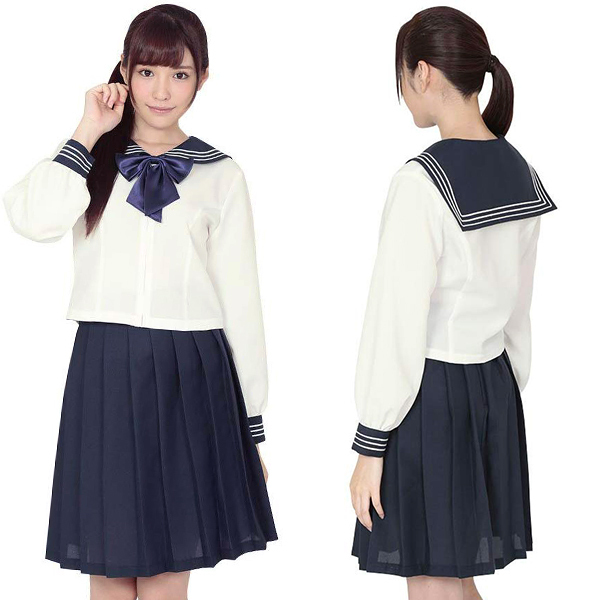 王道のセーラー服をアレンジ!前開きで襟や袖口の3本ラインが特徴的な長袖のセーラー服コスプレです。ミドル丈のスカートにはプリーツがたくさん入っていて、正統派の学校制服となっていますが、着用もしやすくホワイトと紺のカラーにより清潔感と清楚さもあわせ持っています!イベント用としてはもちろん、学生気分に浸りたいときにもオススメです。