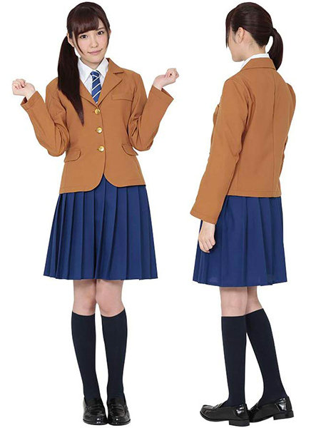 タイトなサイズ感とベージュのカラーが新鮮な制服っぽさ抜群の制服コスプレです。フロント部分の金ボタンは温かみのあるモカ色で、ブルーのストライプ柄のネクタイと相まって可愛らしさとかっこよさを見事に演出!スカート部分は明るめのネイビーカラーに膝上のプリーツスカートなので、学校制服の王道っぽさも兼ね添えています。ジャケット・スカート・ネクタイがセットになって、大変お買い得な制服コスチュームです!