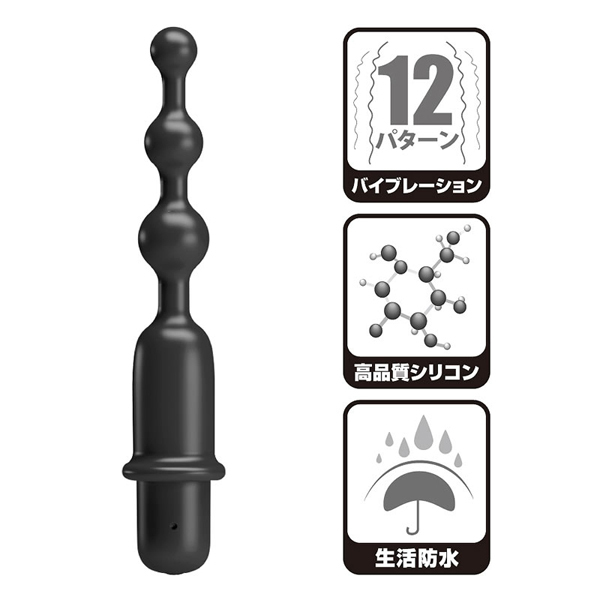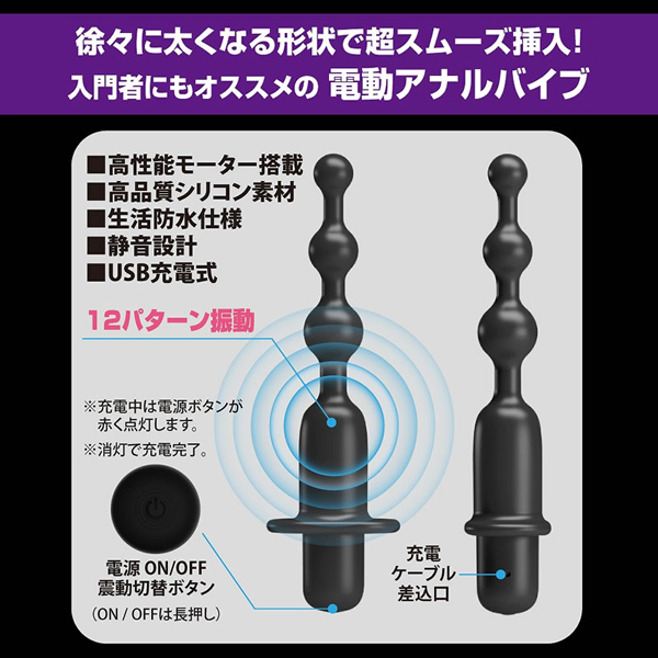 約13cmの小柄なボディで力強い働きをしてくれるバイブレーター。形状は3連ビーズデザインで、素材には肌に優しい高品質シリコン素材を採用♪最大幅は2.1cm、先端から根元にかけて徐々に太くなる形状だから初心者でもスムーズに挿入できます。また、本体には12パターンもの多彩な振動を搭載!高性能のモーターで身体の深部まで刺激します。アナルビーズとして使うのもいいですし、振動を加えて楽しむのも、好みに合わせた使い方でお楽しみいただけます♪USB充電式だから使用の際はコードが邪魔になることはなく、もちろん場所も問いません。90分の充電で、およそ60分の連続稼動が可能となっております♪