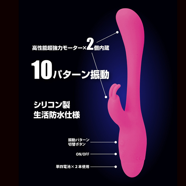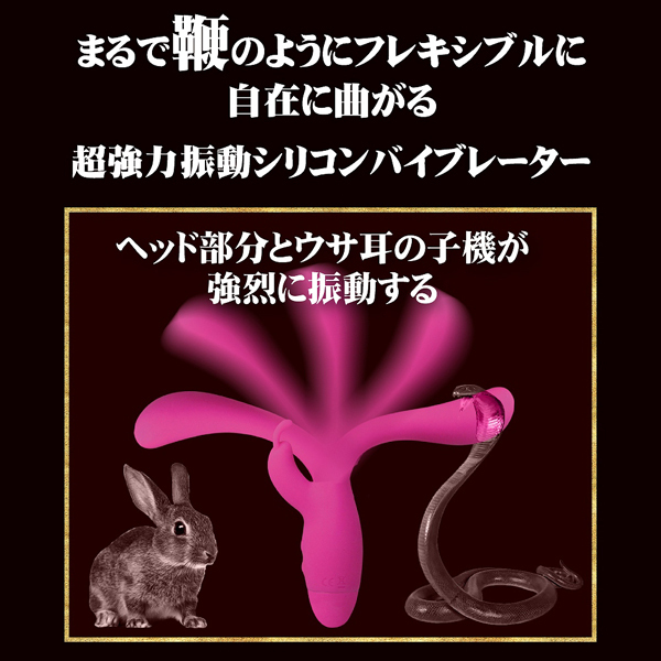 鞭のようにフレキシブルに曲がるという、これまでに余り類を見ない画期的な挿入シャフトを備えたGスポバイブです。先端部分とクリバイブに内蔵されている強力モーターが生み出すバイブレーションは圧巻!滑らかな肌触りのシリコン製ボディは挿入しやすく、先端はぷっくりと膨らんでいてGスポットを狙いやすく、クリバイブはうさぎの耳の形となっているためしっかりとクリを捉えてくれます♪挿入すると穴道に合わせて追随するフィット感バツグンの先端構造は思わず垂涎モノ!10パターンもの豊富な振動に動同期する挿入部とクリバイブは、どちらも生活防水仕様なので使用後のメンテンス性にも大変優れています。