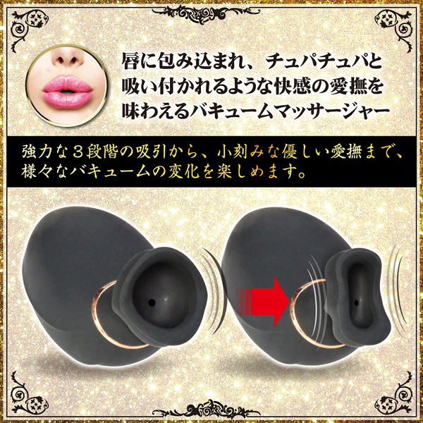 まるで本物の唇に包み込まれながらチュパチュパと吸い付かれるかのような愛撫感が味わえるバキュームマッサージャーです。強力な3段階もの吸引から小刻みで優しい愛撫まで、計8種類もの多彩なバキューム変化が味わえる贅沢仕様!それぞれ異なる感覚でチュパチュパと乳首やクリを刺激する快感は思わずクセになってしまうほど♪メディカルグレードのシリコン素材は肌触りも大変良く、持ちやすく膨らんだボディは長時間のプレイにも適しています。生活防水設計でUSB充電式(コード付属)!90分の充電時間で連続稼働は40分間お楽しみいただけます。