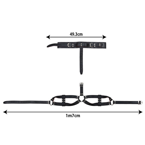 「Abyss」シリーズから登場したハーネスベルトのような合皮製ボンデージは、ハード系ファッションにも活用できそうなデザイン。柔らかなフェイクレザーは着け心地よく、ベルト調節が出来るから痕に残りにくい♪胸中央のリングは首輪とバスト部分のベルトを繋ぎ留めており、取り外すことで首輪のみ使用することも可能!首輪にはチェーンや紐を連結させられるリング付きなので、別アイテムと組み合わせての使用も可能です。
