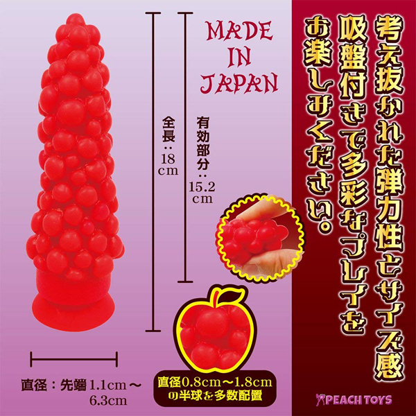 103粒の果実が内部をゴリゴリと刺激する感覚!葡萄のような形状で表面に球状の突起がいくつも配置された日本製のディルド。底は吸盤付きで、貼り付けられる場所ならどこでもOK!バックや騎乗位など、様々な体位でのプレイが可能♪スタンダードと比べてしなるような柔軟性はなく、名前の通りハードな高弾力ボディで粘膜を押し広げながら刺激するため、通常のディルドでは物足りなくなった中〜超上級者さん向けの商品となっています。