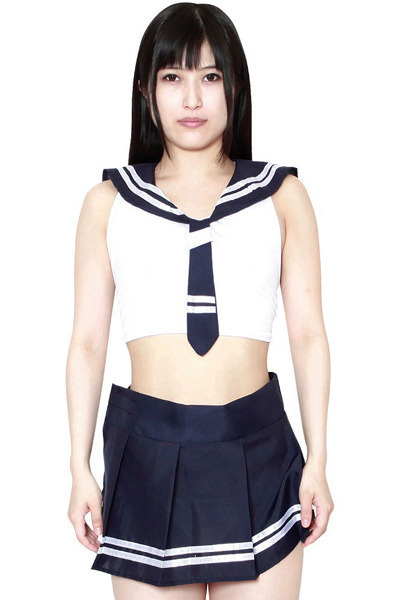 ネイビー×白の定番セーラー服を色気たっぷりに仕上げた、後ろ結びミニ丈トップスとマイクロ丈プリーツスカートの2点セット!セーラー服特有の大きな襟と、ボックスプリーツスカート、そして紺色のネクタイには太目の白ラインを2本施しています。全体的に露出度高めのデザインはカップルや夫婦でのお楽しみにピッタリです♪
