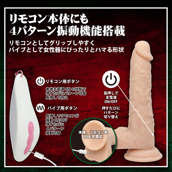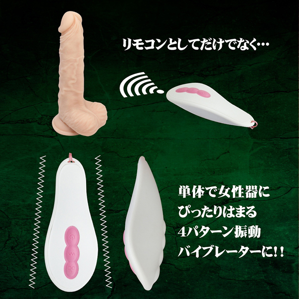 リアルなフォルム、肉感、人肌温度、さらにリモコンまで振動する多機能な「狂喜乱舞なディルド」は快感必至のリモコンバイブレーター!芯は硬めで皮は柔らかい2層構造。よりリアルな挿入感が味わえます。リモコン本体も4パターンの振動機能を搭載。女性器にぴったりとハマる第二のバイブとしても使用できます。●6パターン振動。●熱い怒張を感じさせる人肌ヒートモード搭載。●強力吸盤付き。想像を絶する狂喜に舞い踊る超リアルな肉感ディルド!淫らに楽しめる快感をぜひお楽しみください。