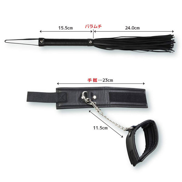 フリーサイズ パッケージ:31.0×19.0×7.5cm セット内容:アイマスク、ボールギャグ、リード付き首輪、手枷、バラムチ
