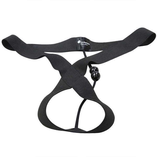 伸縮性のある黒の太ベルトで男性器を支える日本製Tバック。会陰やお尻を刺激するゴム球付きで、細めの紐がお尻の割れ目に食い込むセクシー仕様!