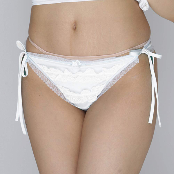 艶やかな光沢のある白生地に同色のフリルとレースを飾り甘く仕上げた日本製Tバック(白)。2段に施されたフリルレースが甘くて可愛い!サイドは紐を結んで留めるタイプなので着脱楽々です♪