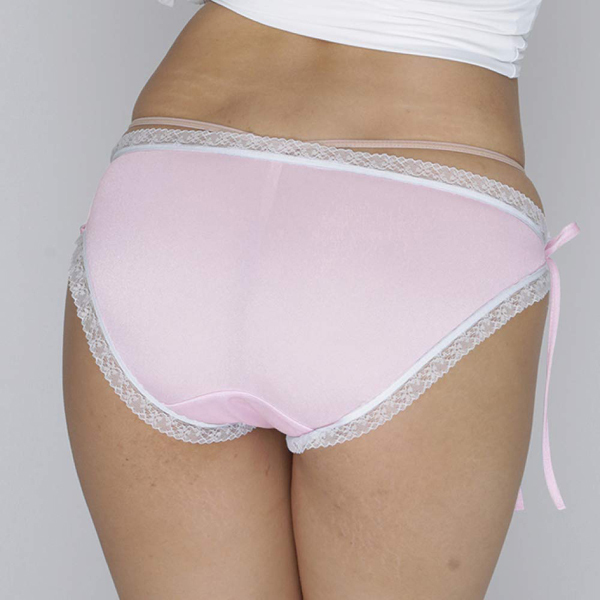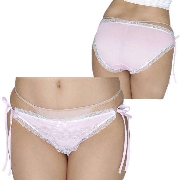 艶やかな光沢感が美しいピンクの生地に2段のフリルレースをあしらった甘くて可愛い日本製フルバック(ピンク)。サイドを紐で留める仕様で脱ぎ着しやすい!可愛く見てほしい特別な夜の一枚に。