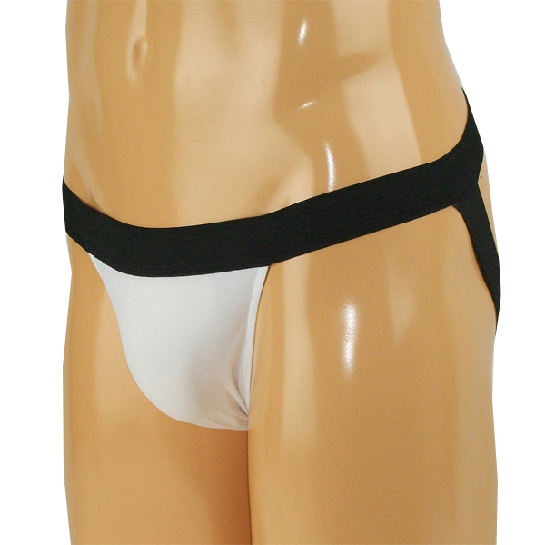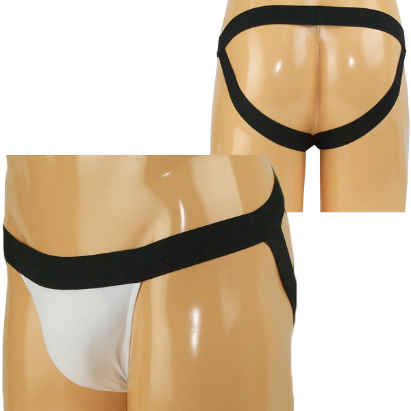 太めの黒い平ゴムが逞しさを感じさせる日本製のメンズ用Oバック(白)。伸縮性の高いストレッチ素材のゴムがウエスト周りにフィット!しっかりとホールドし安定した穿き心地を生み出します。後ろは開放的なオープン仕様!