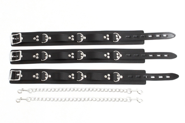 パッケージ:48.0×20.0×2.5cm 本体:首輪(55.5×5cm・ベルト穴5個)・太ももベルト(55.5×5cm・ベルト穴5個)・拘束チェーン41.0cm セット内容:首輪×1本、太ももベルト×2本、拘束チェーン×2本 素材:合皮、金具