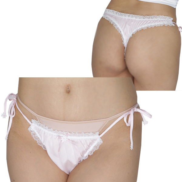 フリフリレースをあしらい可愛く仕上げた光沢の美しい日本製Tバック。クシュッとしたパステルピンクの生地で柔らかな印象を与え、サイドを紐タイプにすることでセクシーさも取り入れた大人可愛いTバックの紐ショーツです♪
