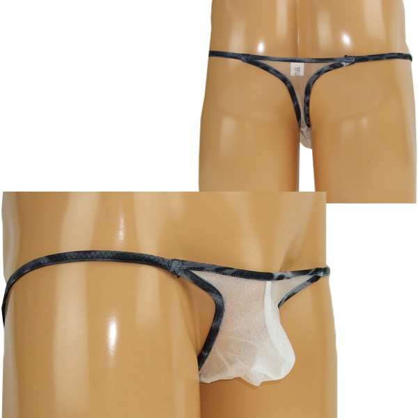 ヒョウ柄でワイルドに!スケスケで男を魅せる極小生地の日本製Tバック(白)。通気性に優れたキラキラ光るシースルー生地をヒョウ柄のパイピングで縁取ったメンズ用のセクシーTバック♪透け素材×マイクロ生地でエロティックに魅せつけろ!