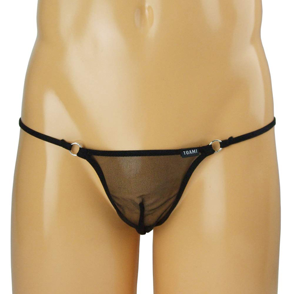 スケスケ素材で大胆に魅せる丸型サイドリング付の日本製のメンズ用Tバック(黒)。通気性の良い極薄生地が男性のシンボルを引き立てる!セクシーさをアピールしたい時だけでなく、蒸れやすい暑い時期にも快適に使用できる一枚です。