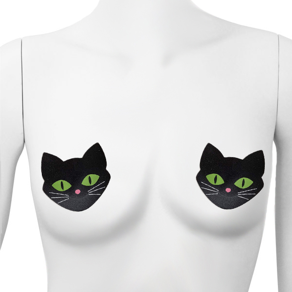 猫の目が暗闇で妖しく光る!蓄光仕様の黒猫ニップレス(2枚1セット)。ハロウィンやホラーイベントに最適♪乳首に触れる裏面中央部分は肌保護のため粘着しない素材を使用しています。
