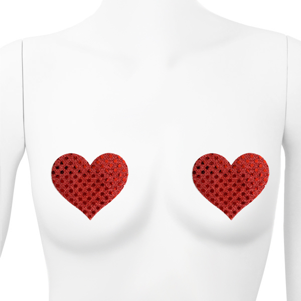 キラキラ煌めくラメで貴方の想いを伝えるハート型のニップレス(赤)。シンプルなデザインで使いやすい!擦れ、透け防止に是非どうぞ♪バストトップ裏面中央部分には粘着しない素材を使用。2枚1セット
