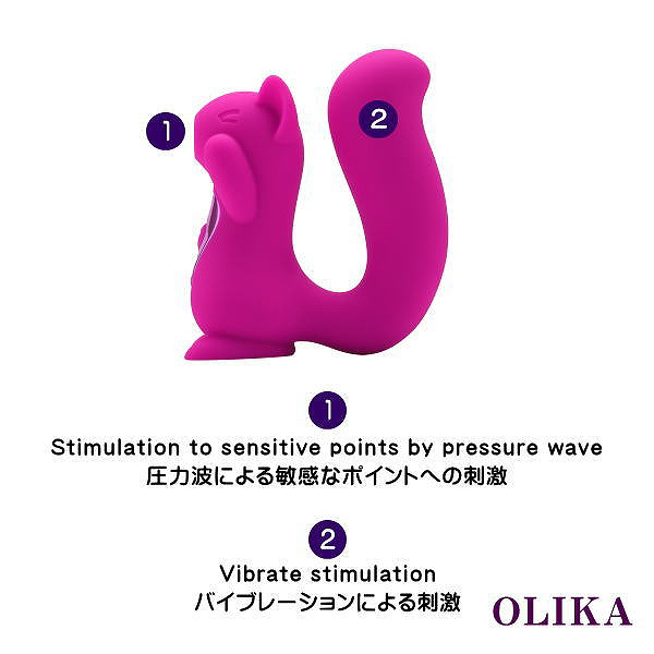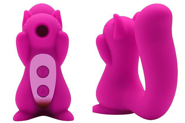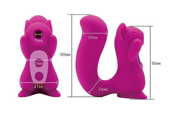 USB充電ケーブル付属。コンパクトサイズの可愛らしいリス型の吸引バイブ。吸引パワーは10段階あるので、優しく吸われるような刺激や強く吸われるような刺激まで幅広くお楽しみいただけます。シッポ部分にはパワフルなモーターが内蔵されているので挿入バイブとしても使えます。吸引バイブを楽しみたい時、挿入バイブを楽しみたい時、その時の気分や気持ちで使い分けできるバイブです。日本語説明書付き。