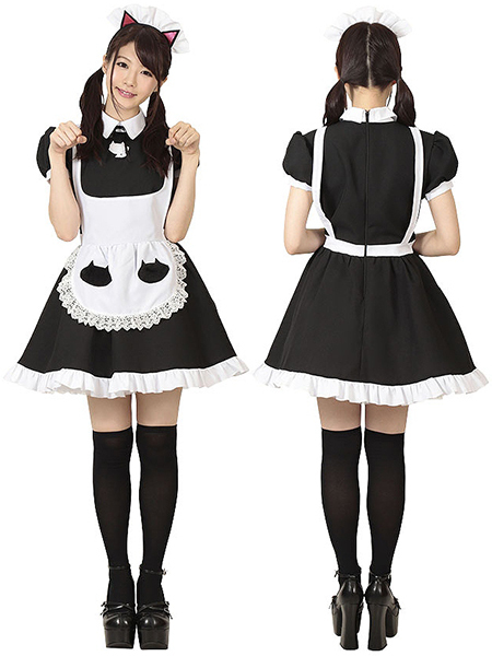 家内安全を招く黒猫メイド♪猫マークを至る所にちりばめた可愛いメイドコスプレ。白エプロンや胸元、カチューシャにも猫!可愛いが詰まった愛嬌たっぷりの萌え系コスチュームです。しっぽ付属