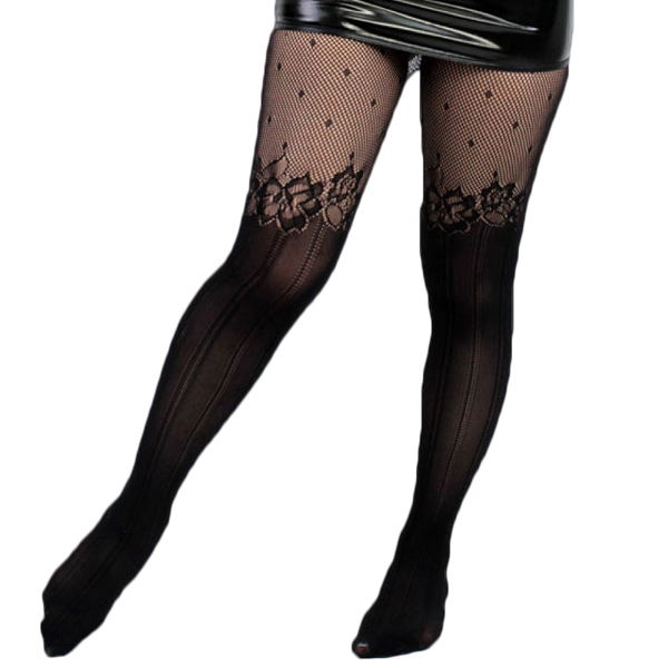 ニーハイ風のデザインがお洒落♪季節問わず使える柄ストッキング黒(ドット×花柄)。ミニスカやショートパンツなどのミニ丈ボトムスと相性抜群!秋冬コーデだけでなく春夏にも使えるセクシーな日本製ストッキングです。